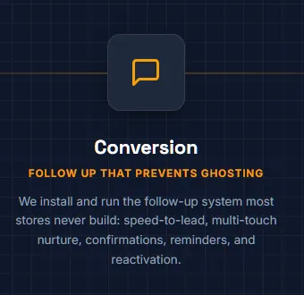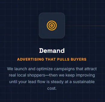 Our approach is different—we build the full system that turns attention into door swings and sales conversations in your showroom.